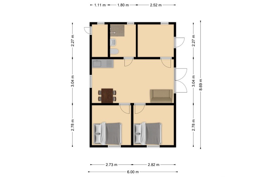 - Внешняя дверь: металлическая, утепленная, с двойным напылением, в комплект двери входит фурнитура, замок и глазок.