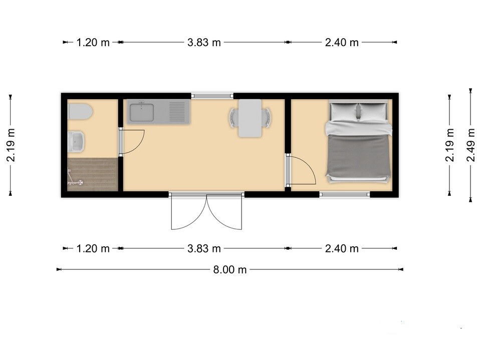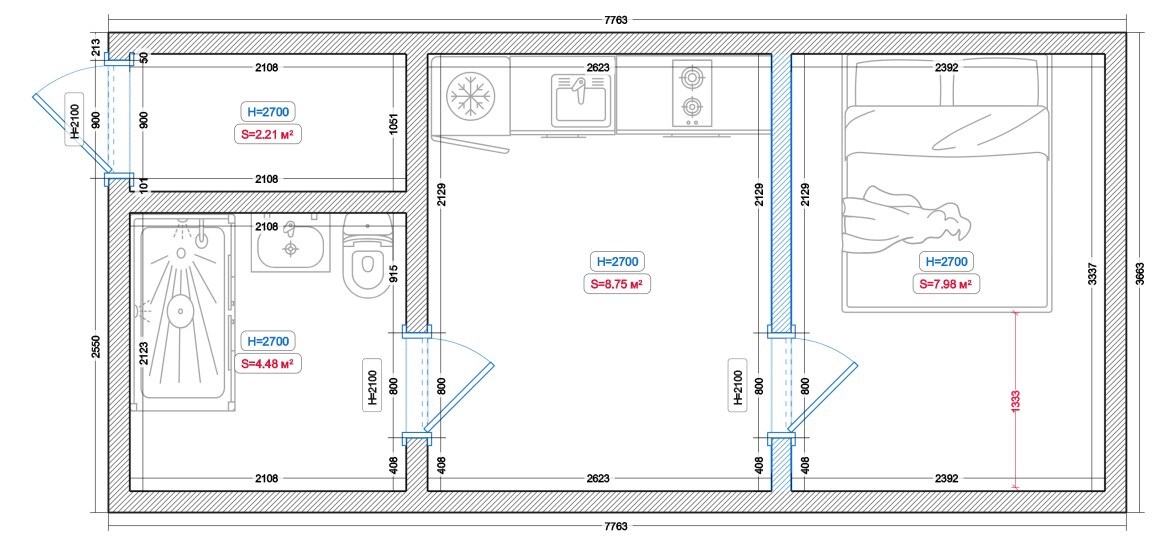 - Внешняя дверь: металлическая, утепленная, с двойным напылением, в комплект двери входит фурнитура, замок и глазок.