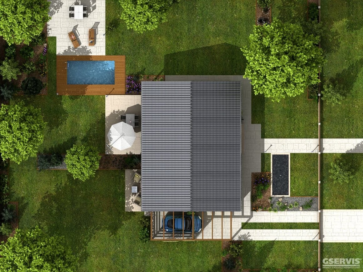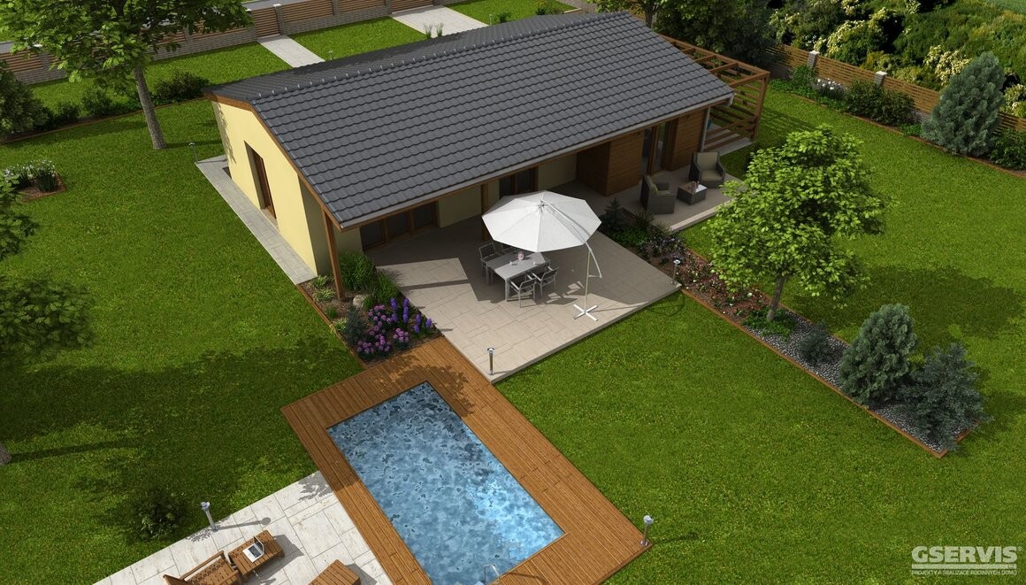 Меньший тип дома с тремя комнатами. Из-за изменчивости кровли можно строить дома Моргана в большинстве мест. Пространство потолка в гостиной обеспечивается скатом крышы, соответственно. деревянная беседка в утопленной части дома. Дом для оптимального участка с минимальной шириной 20 м.