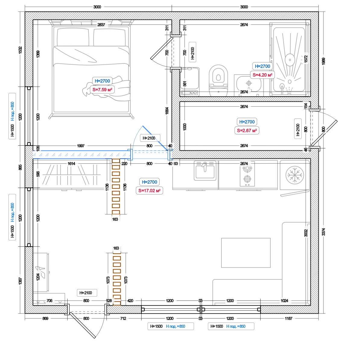 - Материал стен (каркас) из высококачественной доски 1 сорта 150х50мм с шагом стоек не более 600мм, с использованием усиленной крепежной системы и дополнительной защитой каркаса от "мостиков холода".