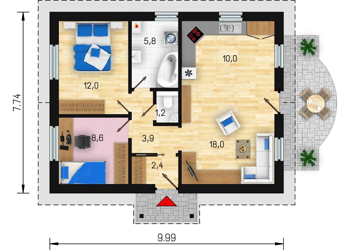 Дом В 77-16 представляет собой дом небольшого размера. Его внутренняя планировка отвечают требованиям для жилья семьи из 3 человек. Зонирование в доме разделено на две части. Зона для отдыха расположена отдельно от студии-кухни. Разделены двумя санузлами, гардеробной и прихожей, что соответствует планированию внутреннего пространства дома для постоянного проживания. Благодаря большому остеклению, в доме достаточное количество дневного света.